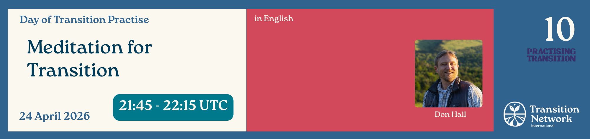 Don Hall is the author of The Regeneration Handbook: Transform Yourself to Transform the World (New Society Publishers, 2024) and Training Coordinator for Transition Network International. Having studied Tibetan Buddhist philosophy and practiced mindfulness-awareness meditation for more than two decades, Don became a certified Meditation Instructor in 2025.